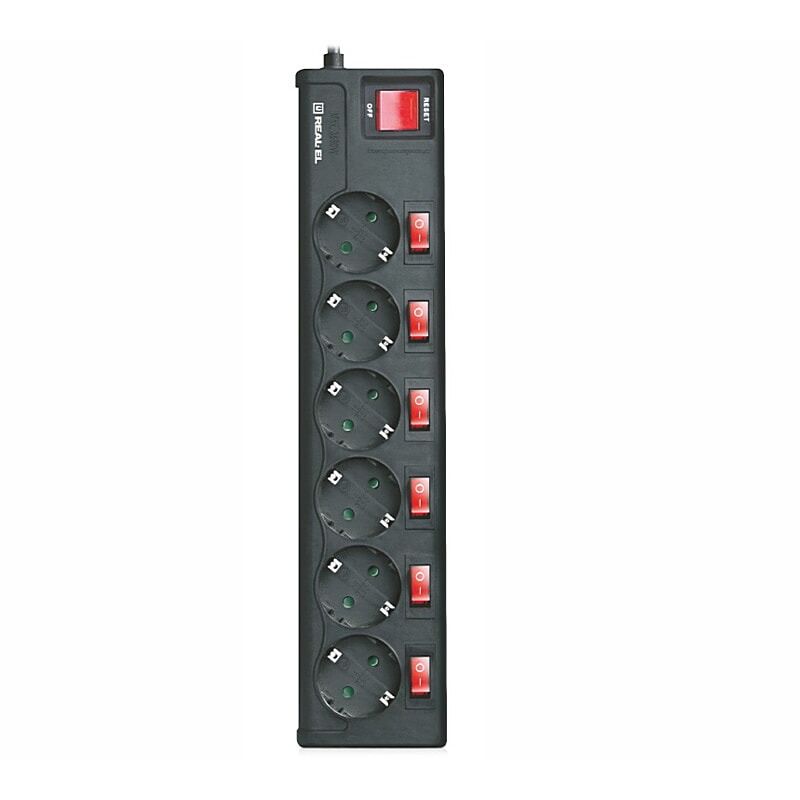 Мережевий фільтр живлення REAL-EL RS-6 EXTRA 3m, black (EL122300002) призначений для підключення до електричної мережі електроприладів і забезпечення їх захисту від високовольтних імпульсів напруги і постійної фільтрації високочастотних перешкод.