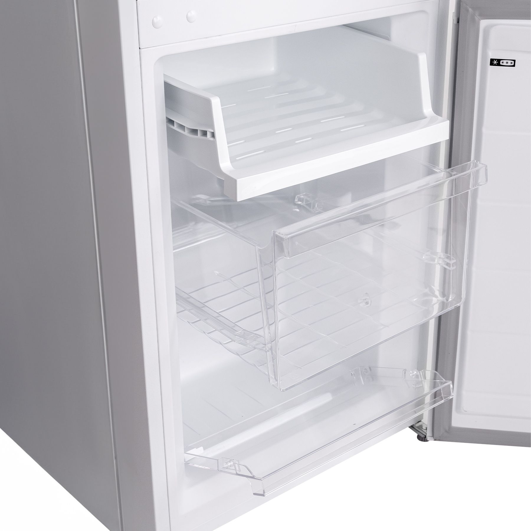 2 скляні полиці обрамлені пластиком для зручнішого користування, а 3 шухляди для зберігання великих продуктів розміщені внизу. 1 кріспер бокс накритий скляною кришкою. Освітлення LED розташоване збоку з напівпрозорим плафоном, щоб не перешкоджати потраплянню світла.