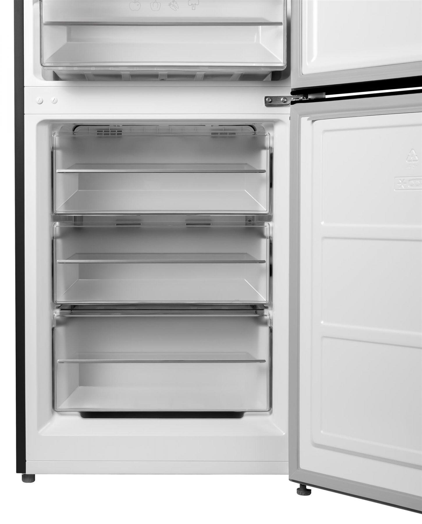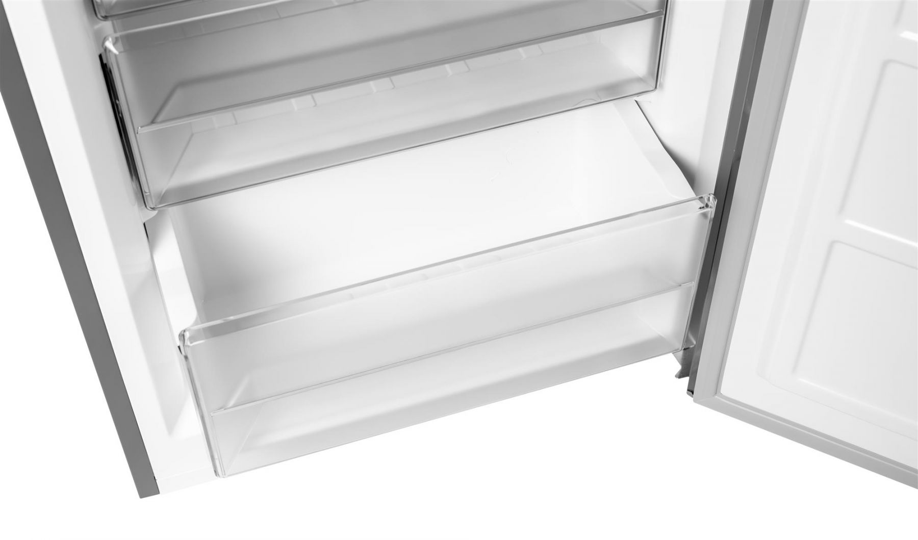 Основний відділ холодильника розрахований на 210 літри та має три полиці з загартованого скла. На них можна розмістити необхідні продукти, а якщо щось не вміщається по габаритах — висота полиць регулюється. Тут же знизу є ящик для свіжих овочів та фруктів, де зберігається рівномірна температура. Широкі та глибокі секції на дверцятах допоможуть безпечно зберігати пляшки та картонні пакети. Усього 3 великі секції.