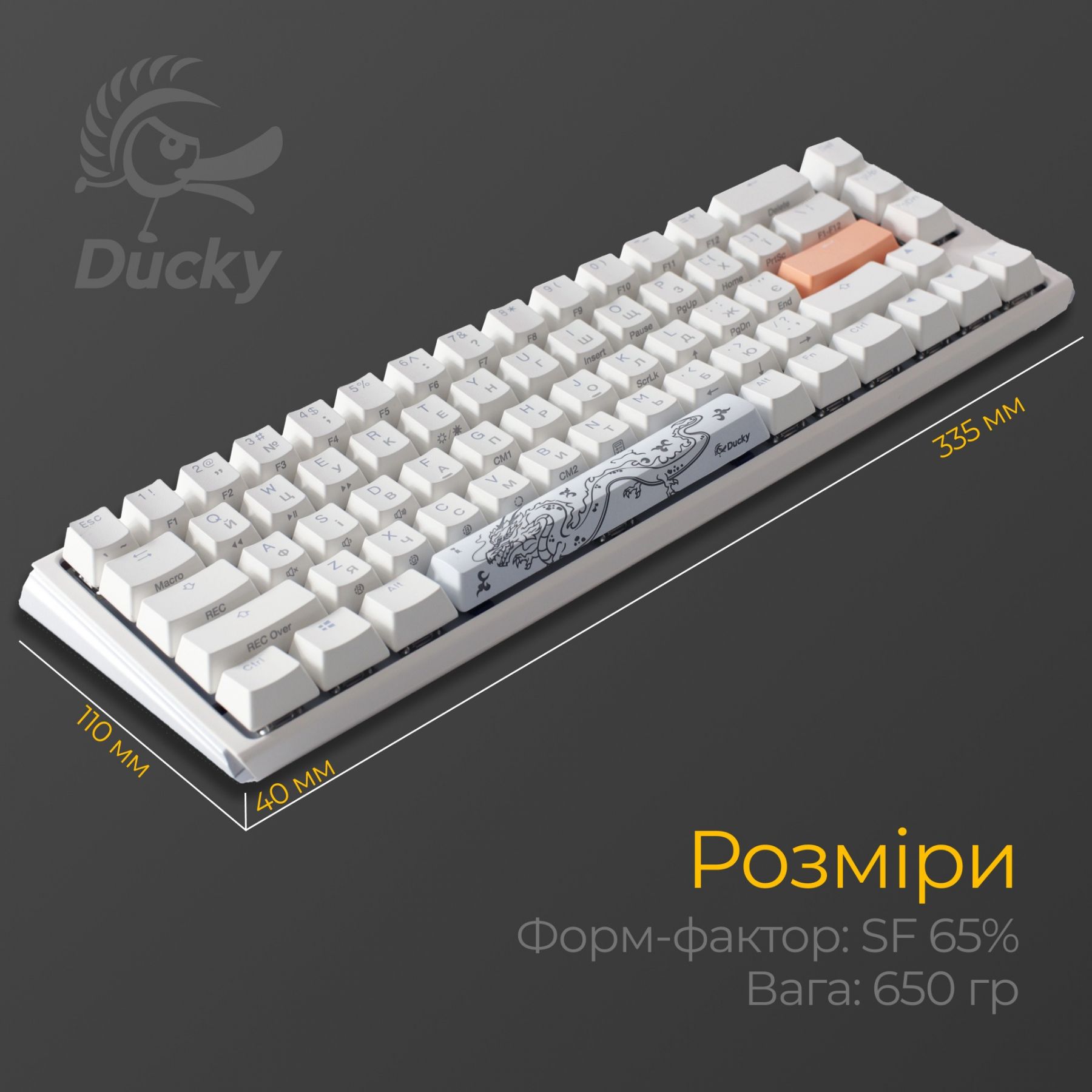 - Дизайн: Клавіатура створена згідно з філософією Ducky «QUACK» Mechanics, що поєднує естетику, функціональність і надійність, а також враховує приємну акустику.