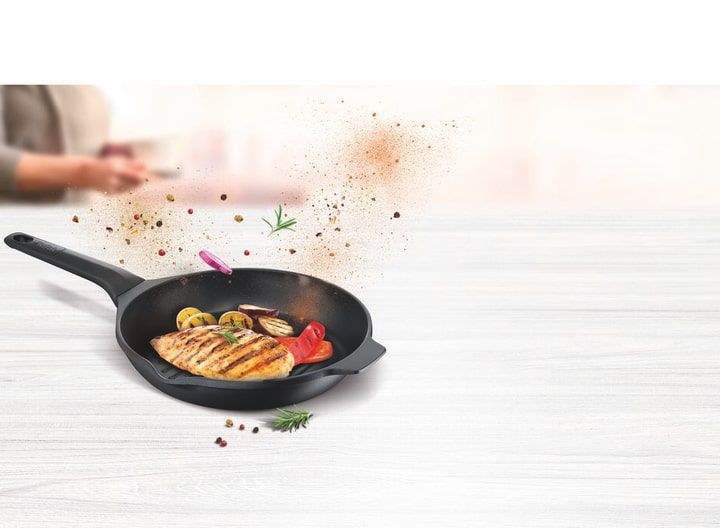 З Delicio від Tefal, насолоджуйтесь елегантною сковородою, яка підвищує рівень вашої кулінарії, для бездоганного вигляду та смаку ваших страв! Приголомшлива конструкція з литого алюмінію з антипригарним покриттям та товстою основою забезпечує ідеальне розсіювання тепла – для рівномірного приготування страв із приголомшливим ароматом!