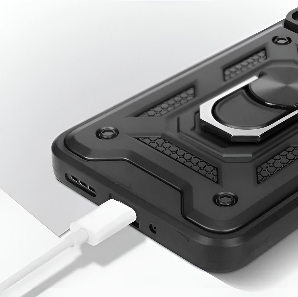 Гнучка силіконова панель має жорсткий металізований корпус та кільце-підставку для пальця. Чохол здатний витримати навіть сильні удари та подряпини.