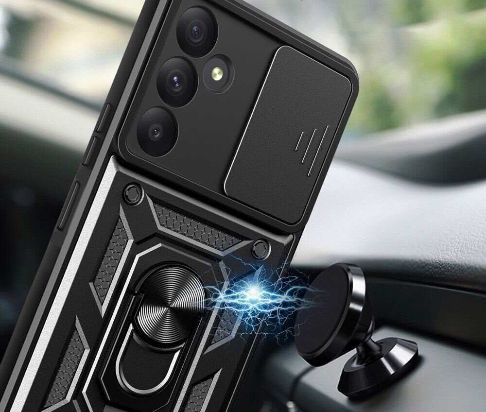 Гнучка силіконова панель має жорсткий металізований корпус та кільце-підставку для пальця. Чохол здатний витримати навіть сильні удари та подряпини.