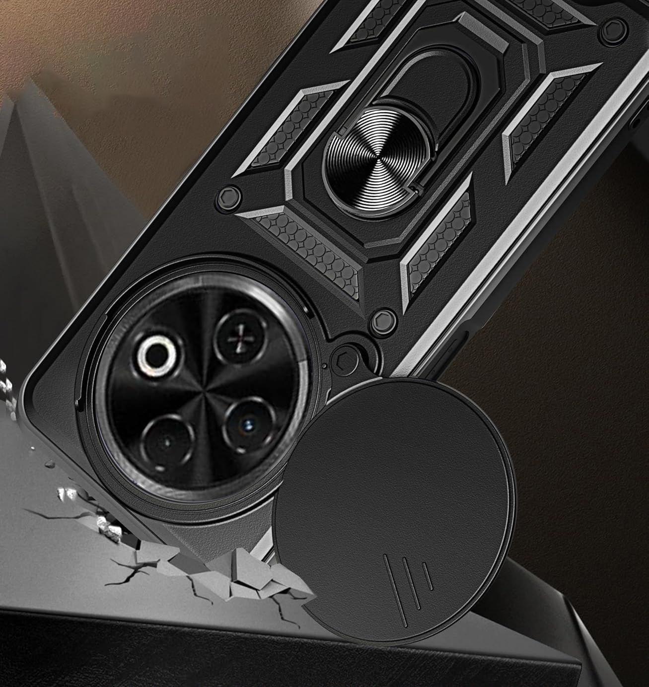 Гнучка силіконова панель має жорсткий металізований корпус та кільце-підставку для пальця. Чохол здатний витримати навіть сильні удари та подряпини.