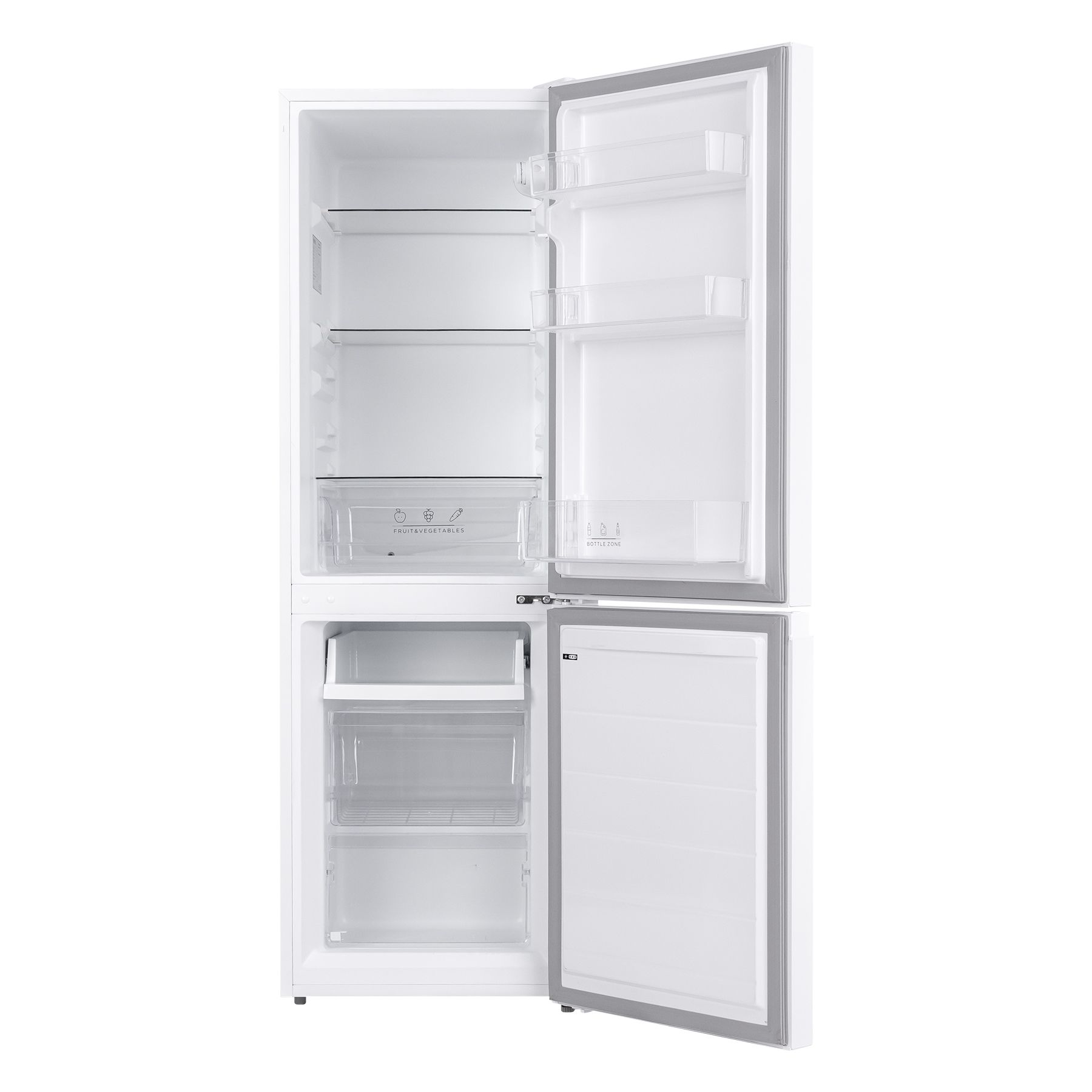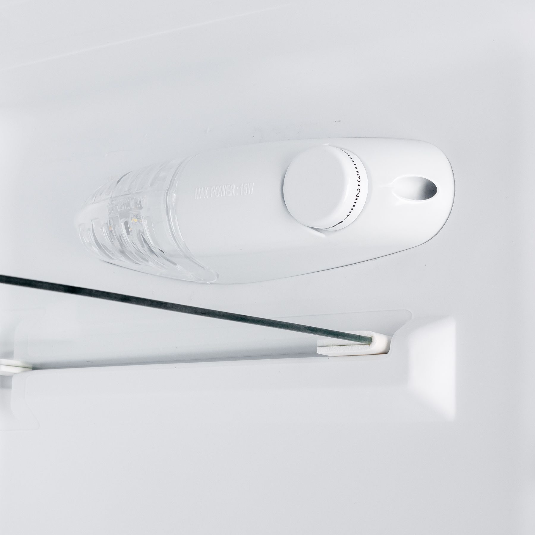 2 скляні полиці обрамлені пластиком для зручнішого користування, а 3 шухляди для зберігання великих продуктів розміщені внизу. 1 кріспер бокс накритий скляною кришкою. Освітлення LED розташоване збоку з напівпрозорим плафоном, щоб не перешкоджати потраплянню світла.
