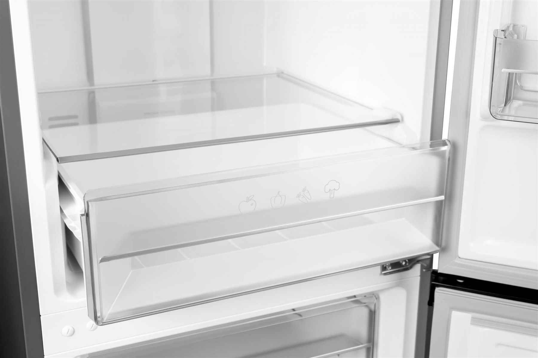 Основний відділ холодильника розрахований на 210 літри та має три полиці з загартованого скла. На них можна розмістити необхідні продукти, а якщо щось не вміщається по габаритах — висота полиць регулюється. Тут же знизу є ящик для свіжих овочів та фруктів, де зберігається рівномірна температура. Широкі та глибокі секції на дверцятах допоможуть безпечно зберігати пляшки та картонні пакети. Усього 3 великі секції.