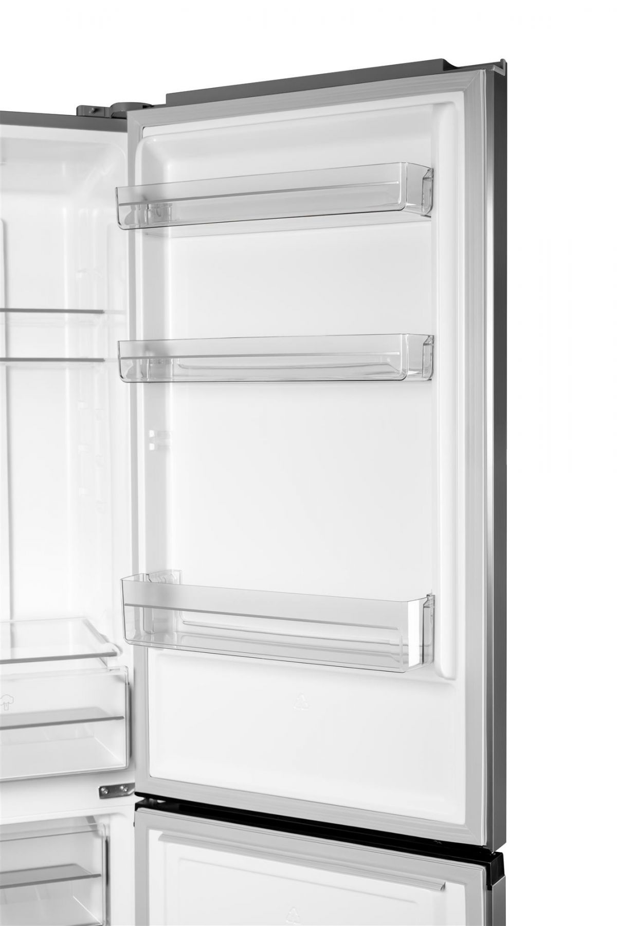 Модель NFN-185X виконана у металевому кольорі, що гармоную з сучасними кухонними інтер’єрами різних тонів. Холодильник висотою 185.8 см має два відділення: