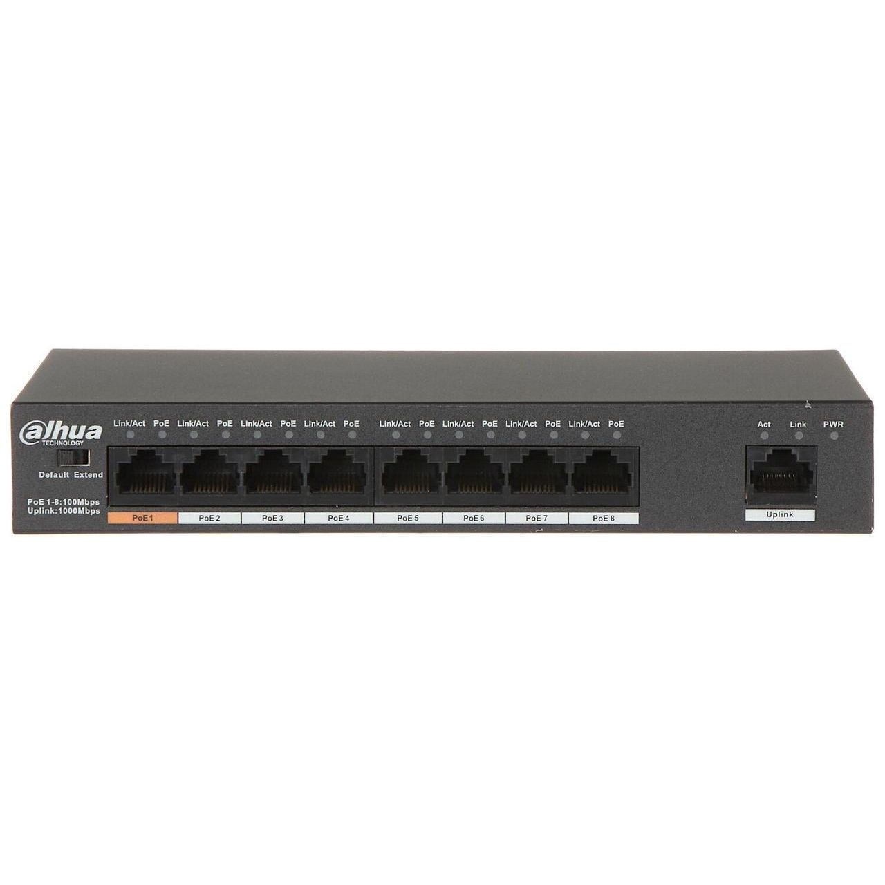 DH-PFS3009-8ET1GT-96 8-портовий PoE комутатор з підтримкою режиму роботи CCTV (передача PoE на лінії до 250 метрів). Забезпечує швидкість передачі по портам в стандартному режимі 100 Мбіт / с, в режимі CCTV 10 Мбіт / с. Перемикання режимів роботи здійснюється DIP перемикачем на лицьовій панелі пристрою.