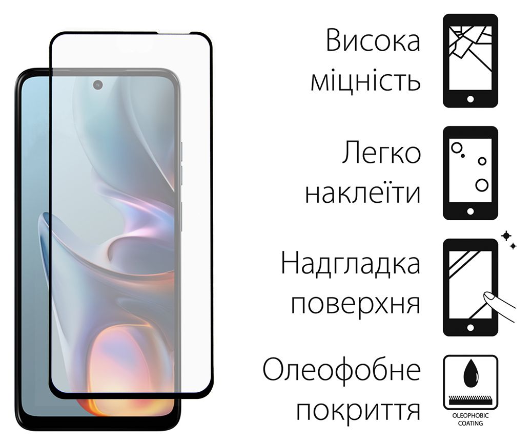 Високоякісне захисне скло DENGOS Full Glue повністю закриває поверхню екрана смартфона, залишаючи доступ до кнопок, динаміків та камери.